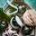 Materiale: Glas, jern (top) og bomuld (tråd)