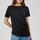 Sort t-shirt med korte ærmer og lige pasform, designet med en diskret drapering i siden. Den brede, runde halsudskæring og det bløde materiale giver komfort hele dagen, samtidig med at toppen holder et stilrent og moderne udtryk.